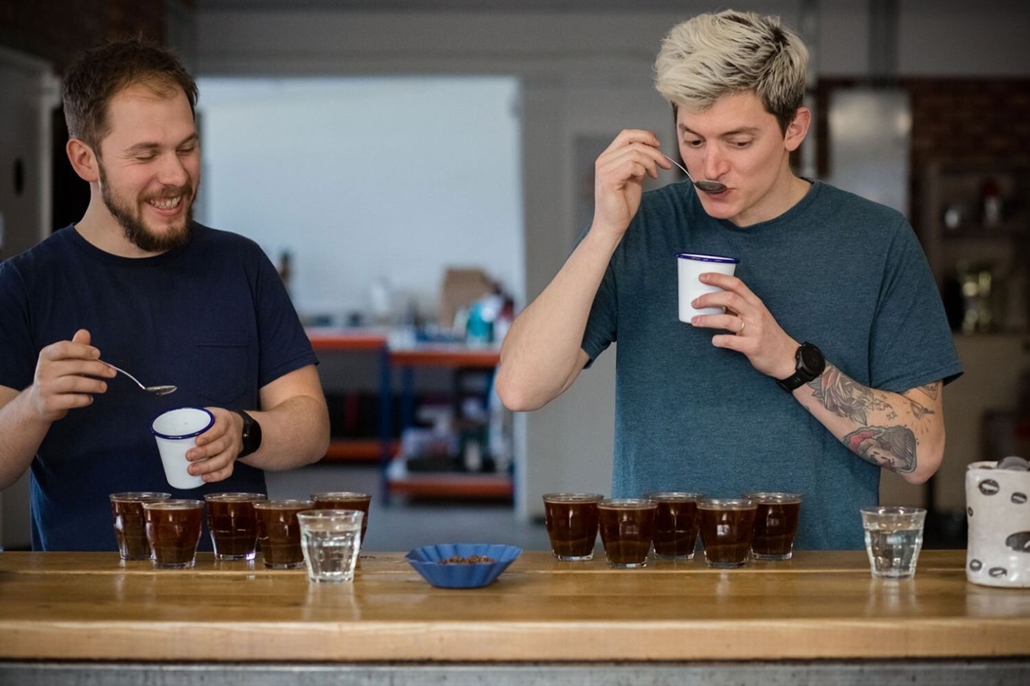 The team of three Q graders work at the Cafedirect Roastery and tirelessly cup all of the small batch roasted coffee. It’s pretty unique to have one Q grader working at a roastery let alone three.