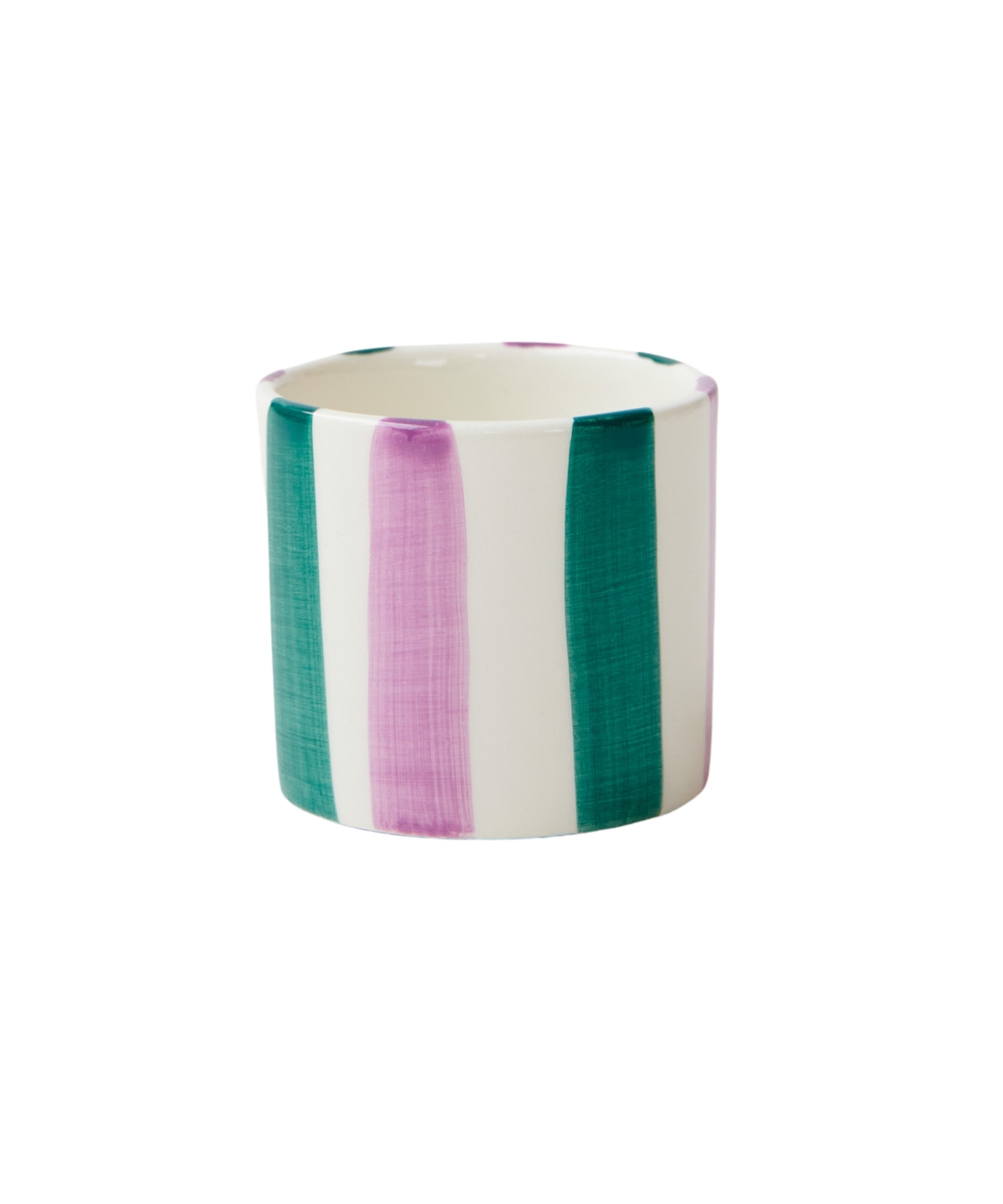 A handmade ceramic cup, in bold stripes of lilac & palm green.