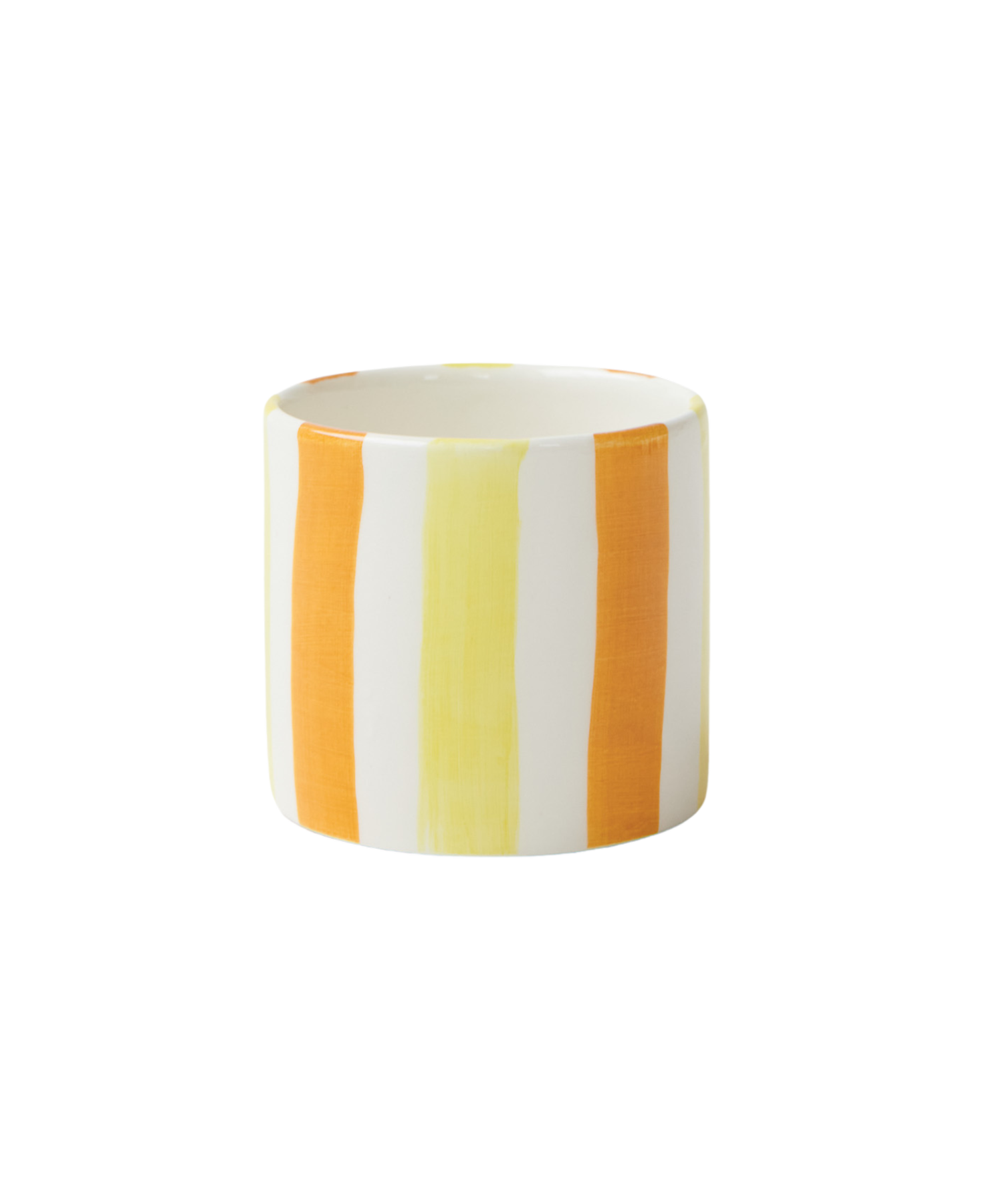 A handmade ceramic cup, in bold stripes of yellow & sunglow orange.