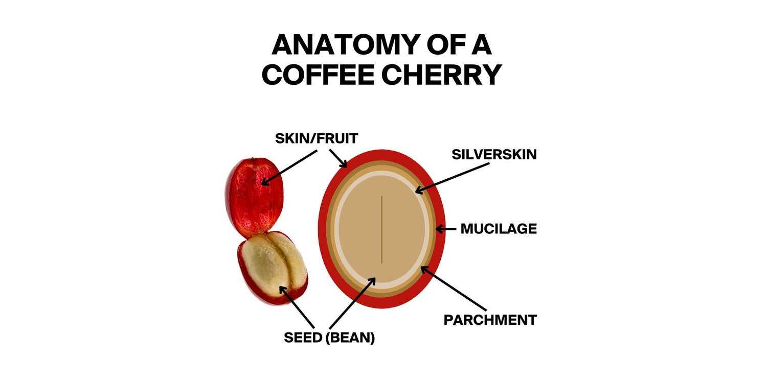 There are a few layers that make up the anatomy of a coffee bean. The outer layer of a coffee cherry is the fruity flesh which is often referred to as cascara (in the Americas) and can be brewed into a tea.